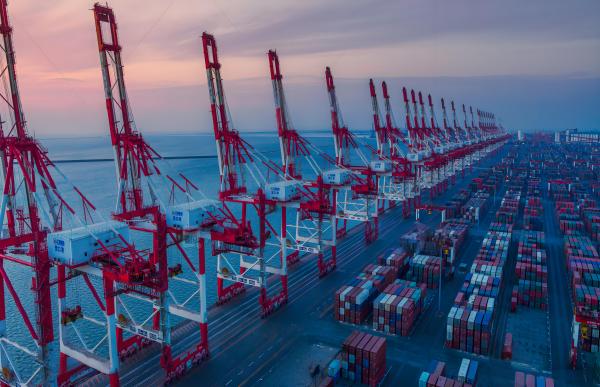 巨大的货轮停靠在码头边,依靠岸电设备供能,等待着次日清晨的再次起航;巨型门式起重机不断将集装箱吊装到靠泊在港的班轮中;远端操控的自动化轨道吊24小时作业,在庞大的堆场中循环往复精准完成吊装任务……