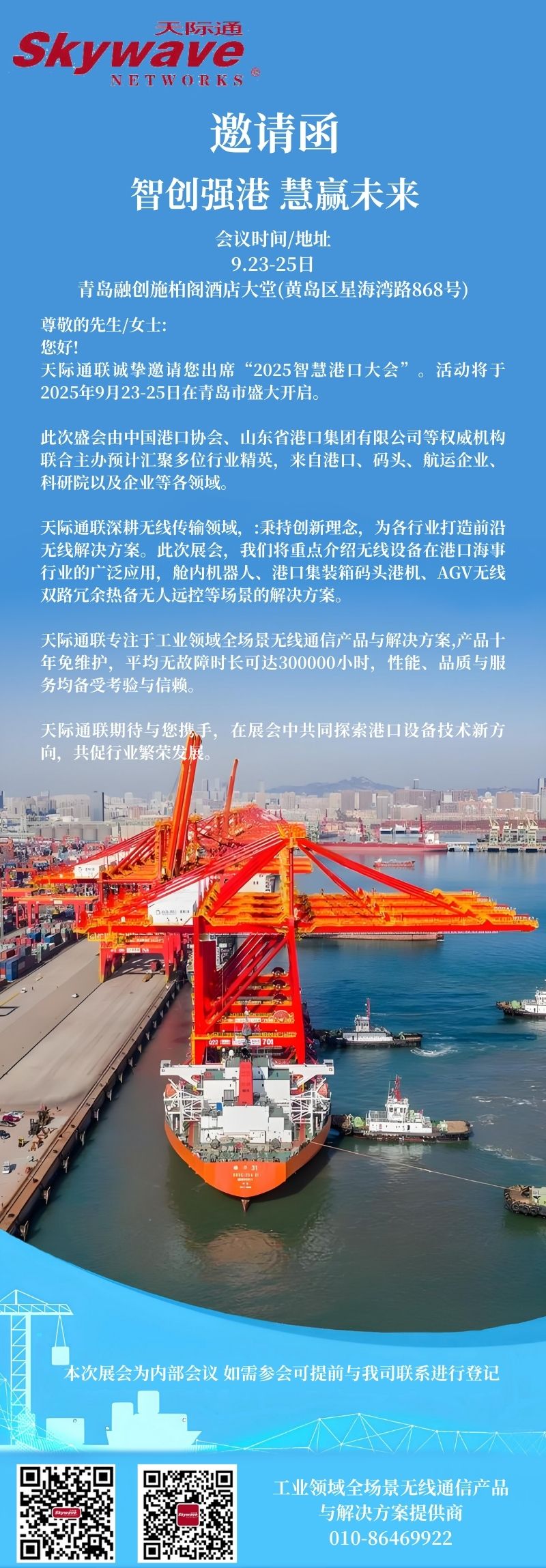 天际通联诚挚邀请您出席“2025智慧港口大会”活动将于2025年9月23-25日在青岛市盛大开启。