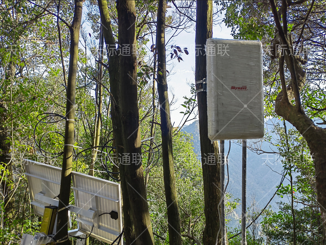 山脚的野保相机离山顶的AP距离远,路径上的树林茂密,野保相机自身的无线网卡连不上山顶的AP,对于这种情况天际通联技术人员在山脚的野保相机处部署无线客户端,山脚的野保相机停止使用自身无线网卡,网线连接无线客户端的数据口,无线客户端代替野保相机自身的无线网卡连AP的wifi,由于无线客户端具备大功率、强穿透、高增益天线、抗干扰、宽温工作、体积小等特点,很好的替换了野保相机自身无线网卡完成和山顶AP的无线连接。